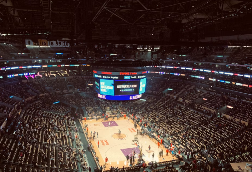 ALT: A wide view of a basketball game at the Staples Center with a large screen and empty seats